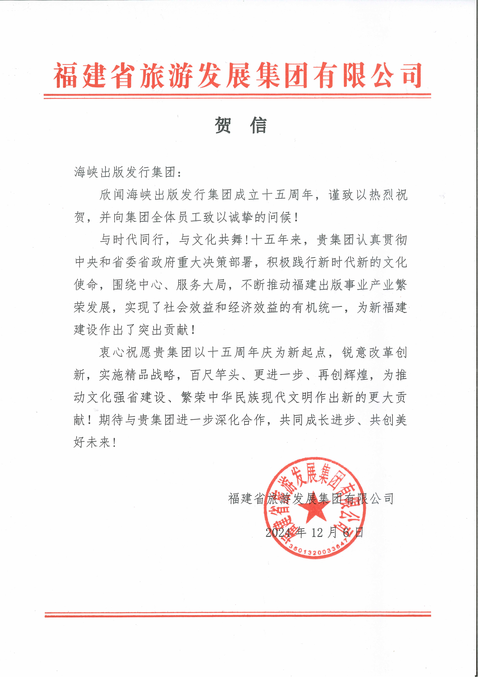 欣聞海峽出版發行集團成立十五周年,謹致以熱烈祝賀,并向集團全體員工致以誠摯的問候!