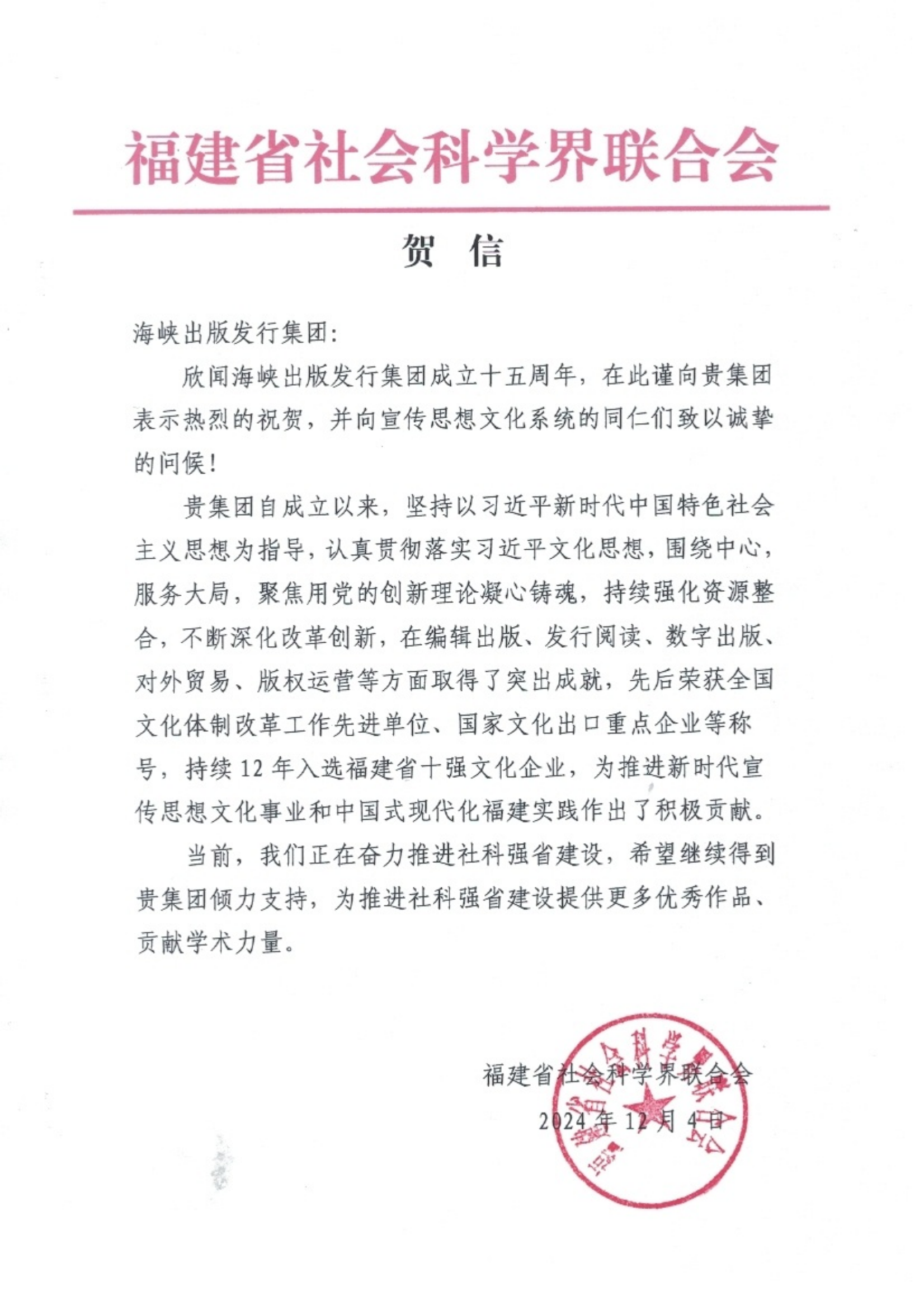 欣聞海峽出版發(fā)行集團(tuán)成立十五周年,在此謹(jǐn)向貴集團(tuán)表示熱烈的祝賀,并向宣傳思想文化系統(tǒng)的同仁們致以誠(chéng)摯的問(wèn)候!