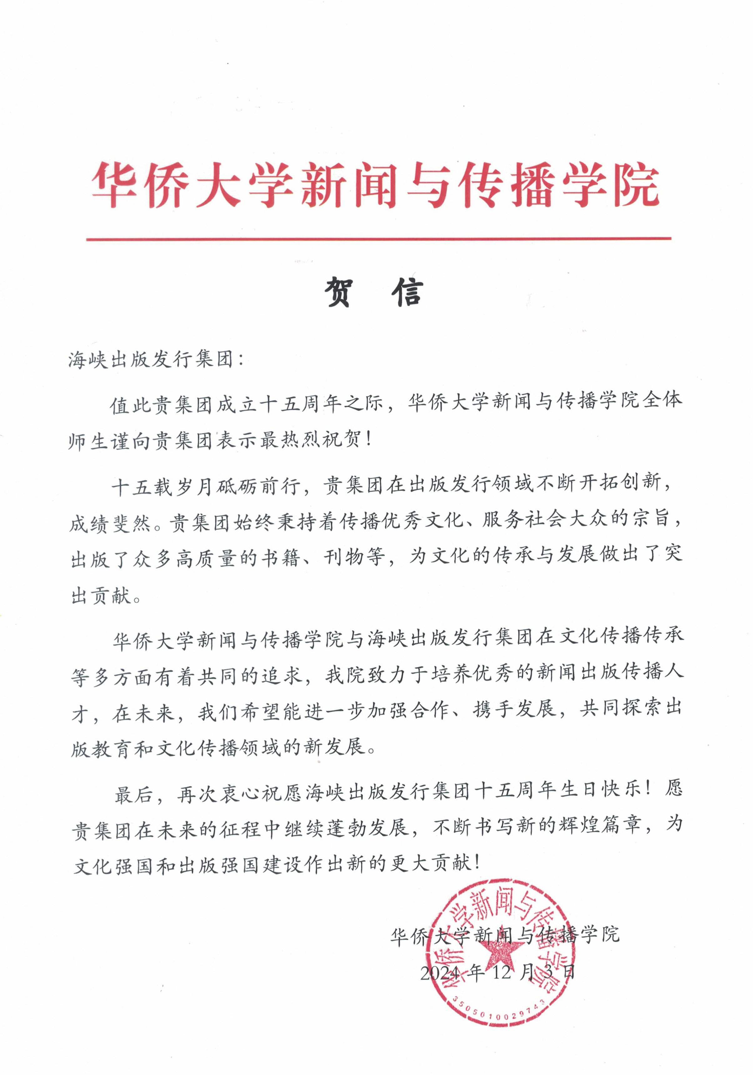 值此貴集團成立十五周年之際,華僑大學新聞與傳播學院全體師生謹向貴集團表示最熱烈祝賀!