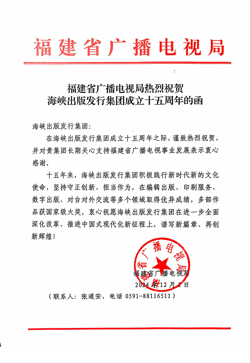 在海峽出版發行集團成立十五周年之際,謹致熱烈祝賀,并對貴集團長期關心支持福建省廣播電視事業發展表示衷心感謝。