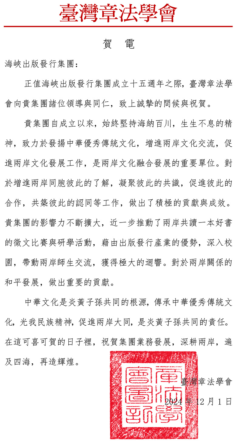 正值海峽出版發行集團成立十五周年之際,臺灣章法學會向貴集團諸位領導與同仁,致上誠摯的問候輿祝賀。