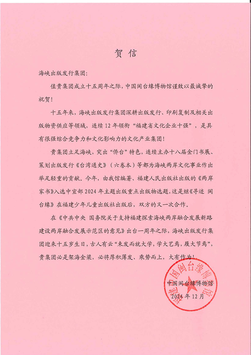 值貴集團成立十五周年之際,中國閩臺緣博物館謹致以最誠摯的祝賀!