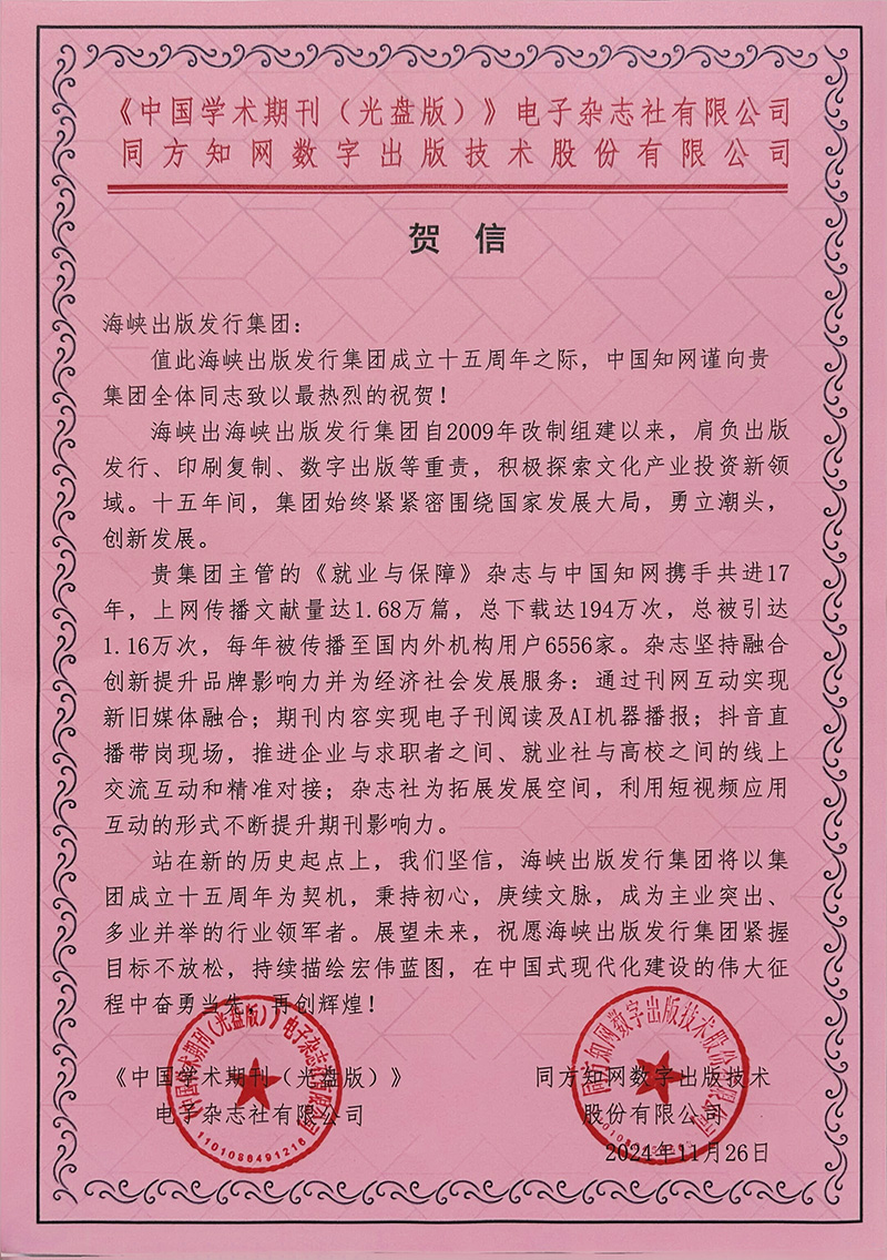 值此海峽出版發行集團成立十五周年之際,中國知網謹向貴集團全體同志致以最熱烈的祝賀!