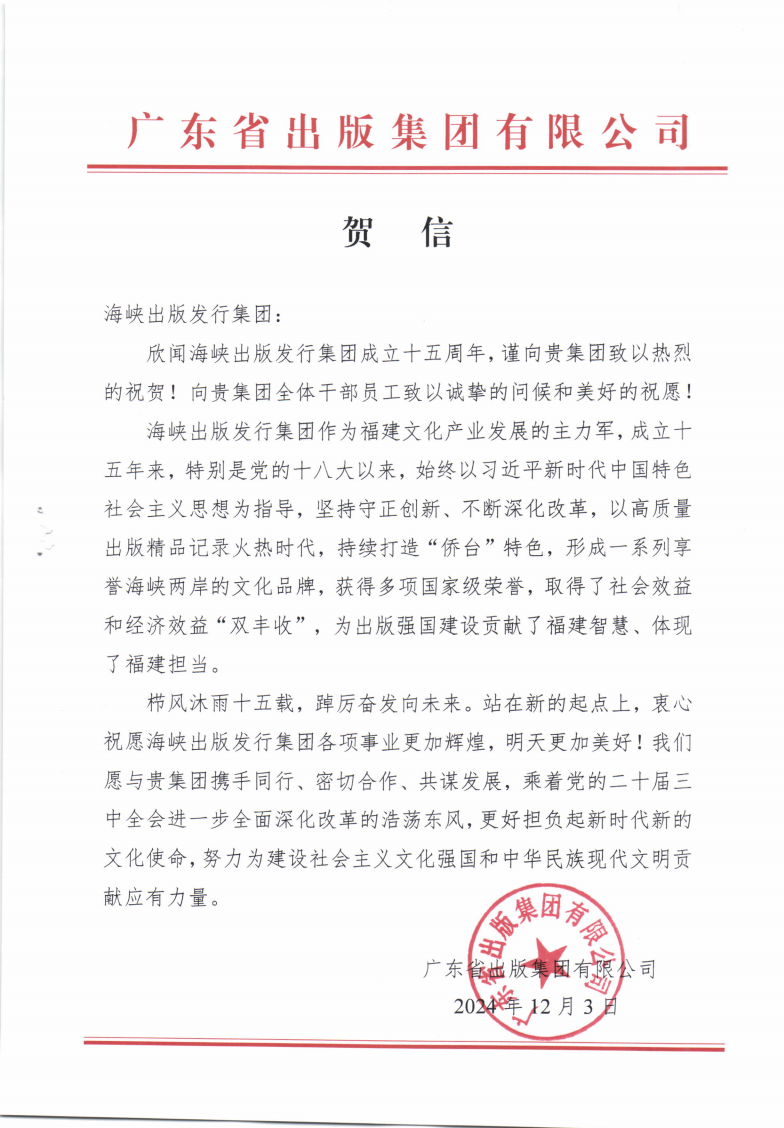 欣聞海峽出版發行集團成立十五周年,謹向貴集團致以熱烈的祝賀!向貴集團全體干部員工致以誠摯的問候和美好的祝愿!