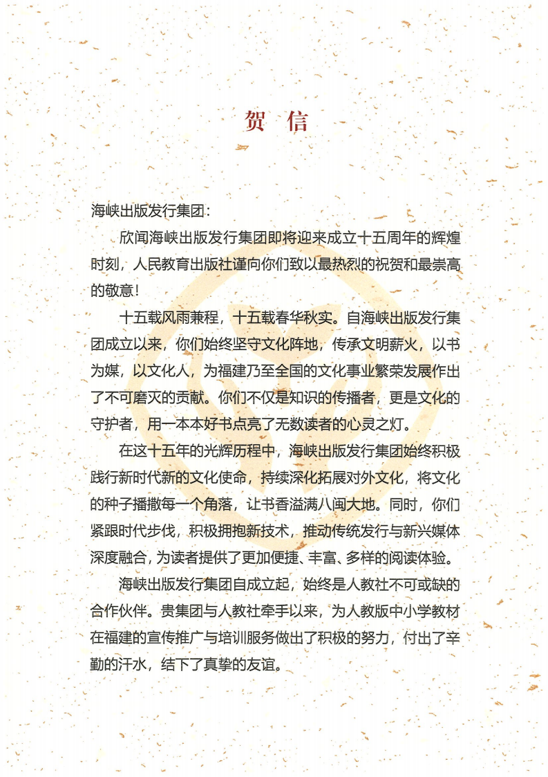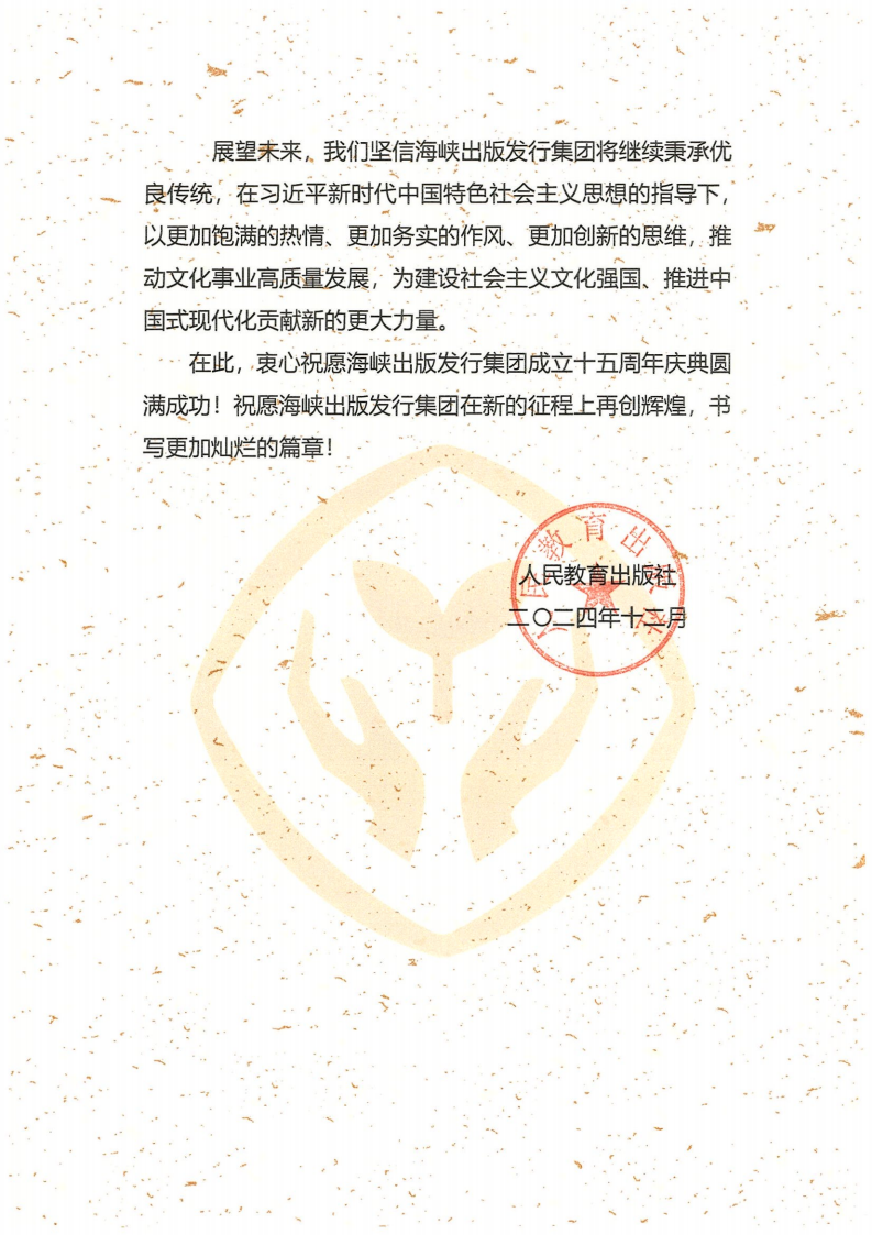 欣聞海峽出版發行集團即將迎來成立十五周年的輝煌時刻,人民教育出版社謹向你們致以最熱烈的祝賀和最崇高的敬意!
