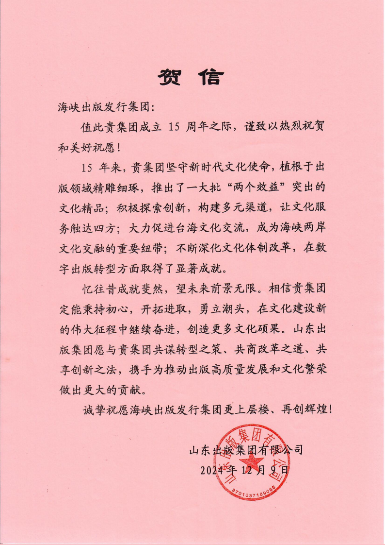 值此貴集團成立15周年之際,謹致以熱烈祝賀和美好祝愿!