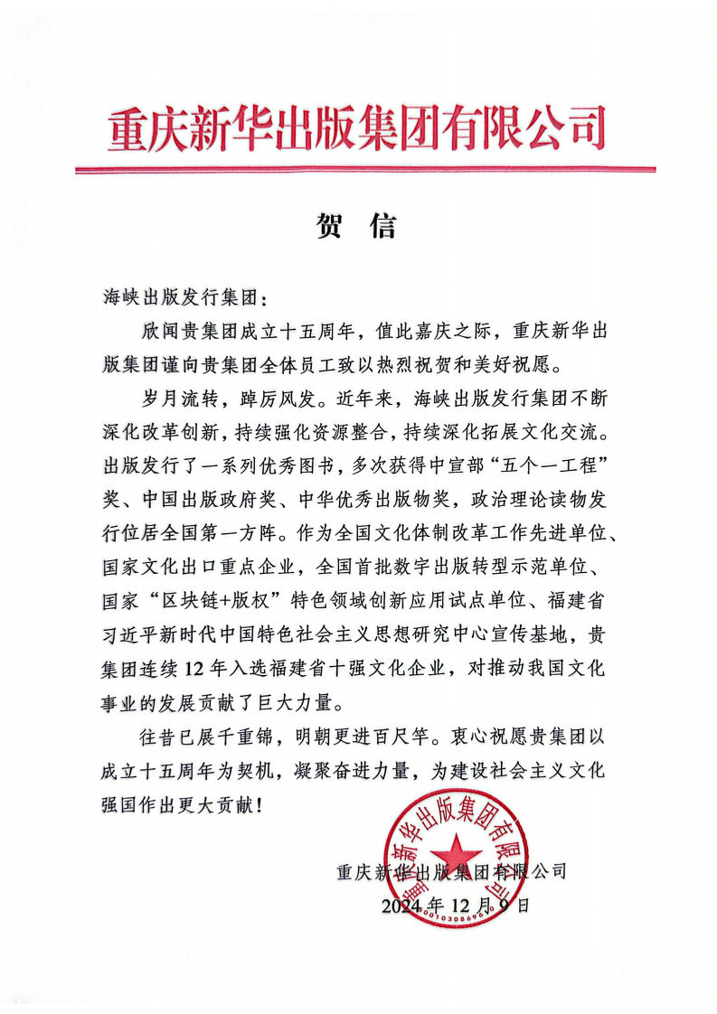 欣聞貴集團(tuán)成立十五周年,值此嘉慶之際,重慶新華出版集團(tuán)謹(jǐn)向貴集團(tuán)全體員工致以熱烈祝賀和美好祝愿。