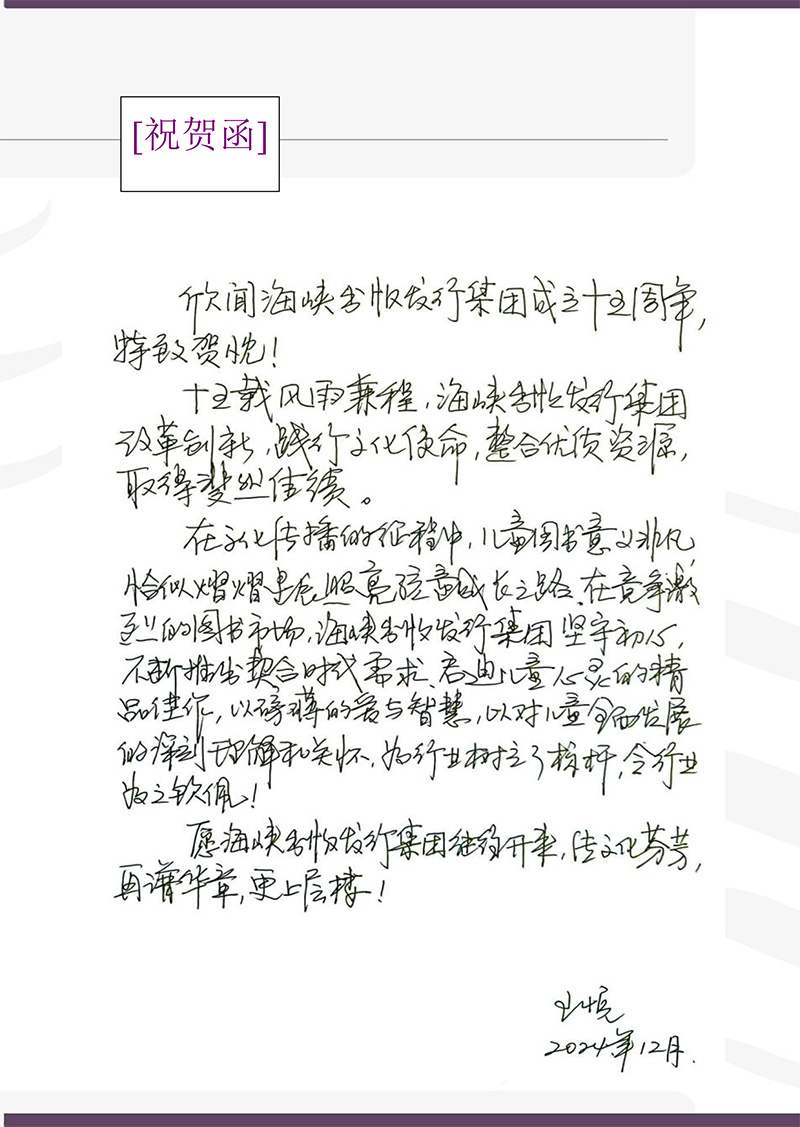 欣聞海峽出版發行集團成立十五周年,特致賀忱!