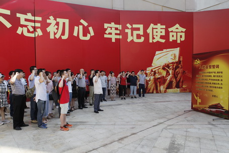 到達(dá)革命歷史紀(jì)念館后,在“不忘初心 牢記使命”主題教育廣場上,全體黨員在社黨總支副書記孫漢生的帶領(lǐng)下,高舉右手,莊嚴(yán)宣誓,重溫對黨忠誠的錚錚誓言。