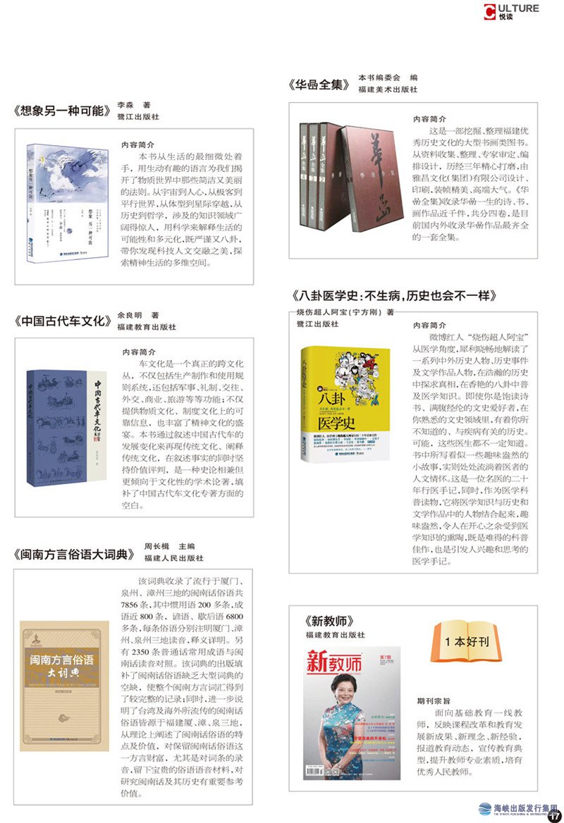 經專家評審委員會初評、集團“好書好刊”評審委員會復評和集團領導班子審定,并經公示,共評出10本好書和1本好刊,10本好書分別是《抗戰家書》(福建人民出版社)、《閩南方言俗語大詞典》(福建人民出版社)、《想象另一種可能》(鷺江出版社)、《中國古代車文化》(福建教育出版社)、《八卦醫學史》(鷺江出版社)、《戴震、乾嘉學術與中國文化》(福建教育出版社)、《中草藥彩色圖譜(第4版)》(福建科技出版社)、《菩提樹下清蔭則是去年》(海峽書局)、《華喦全集》(福建美術出版社)、《漁童》(福建少兒出版社);1本好刊是《新教師》(福建教育出版社)。