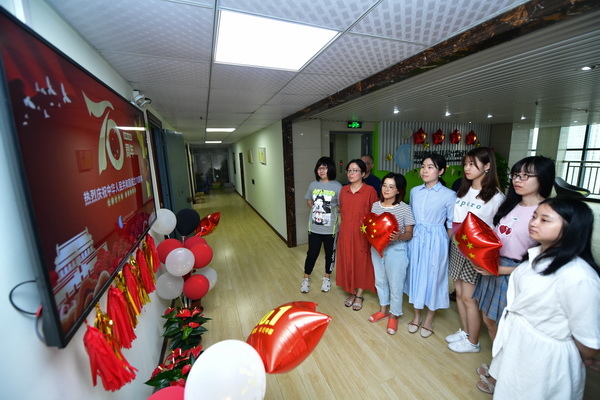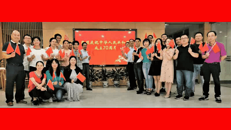 海峽文藝出版社制作國慶70周年標志圖案,懸掛小國旗、小燈籠、紅色氣球等裝飾物,同時組織全社員工舉行慶祝新中國成立70周年聯歡活動,大家現場合唱《我和我的祖國》,將氛圍推向高潮