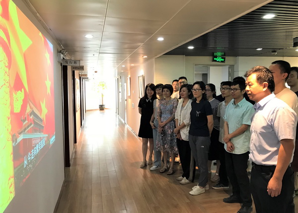 福建美術出版社應用新穎的電子投屏,展示該社精心制作的主題海報,組織全體員工觀看《我和我的祖國》電影MV視頻,進行愛國主義主題教育
