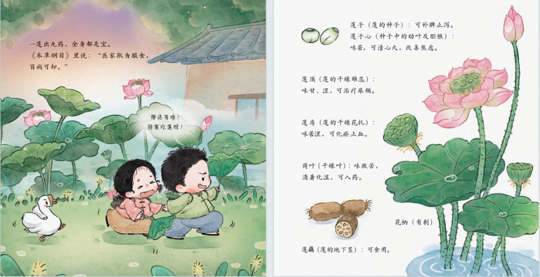 本書以大龍爸爸與兒子小龍包的漫談與生活貫穿全書,他們在戶外郊游中,發現和尋找自然里的中草藥——鵝不食草、荷葉、浮萍等,再通過孩童熟悉的古詩《詠鵝》《江南》《池上》,串聯起一個個有趣的草藥知識與互動體驗。