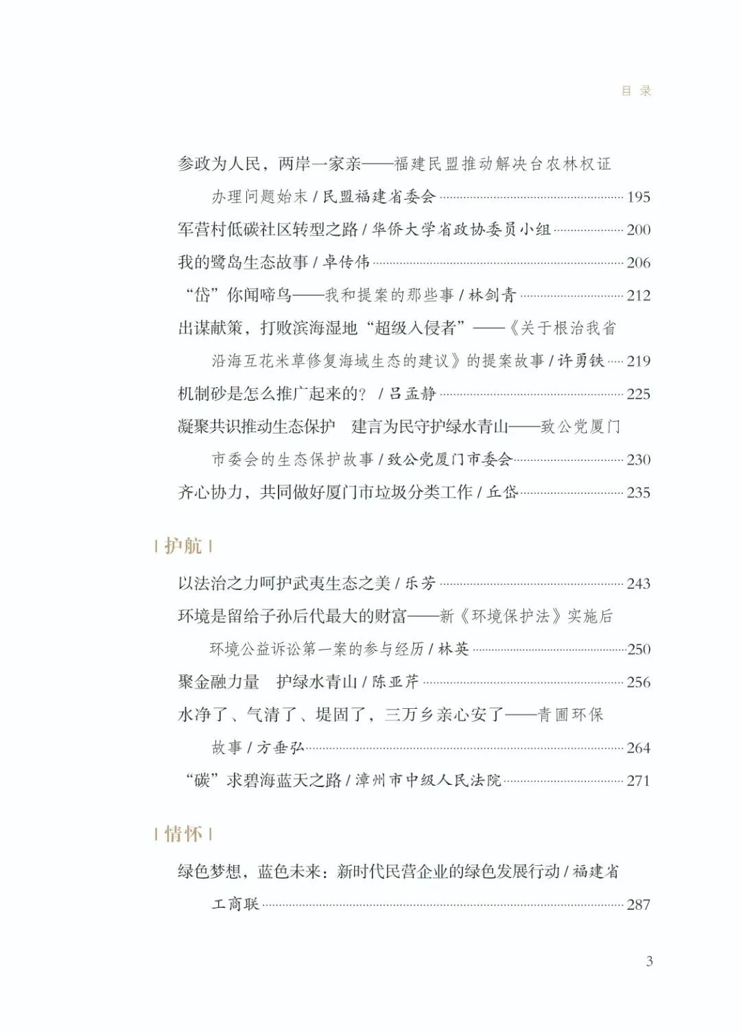 翻閱本書(shū),欣見(jiàn)各級(jí)政協(xié)組織和各民主黨派、工商聯(lián)在新福建建設(shè)中所發(fā)揮的重要作用。文章作者大多為各級(jí)政協(xié)委員,他們親歷、親見(jiàn)、親聞了新時(shí)期福建生態(tài)文明建設(shè)的探索實(shí)踐,以飽含深情的筆觸,生動(dòng)描繪了福建在林權(quán)制度改革、水土流失治理、國(guó)家公園保護(hù)、碳減排、河長(zhǎng)制、生態(tài)銀行、環(huán)境執(zhí)法等方面的新進(jìn)展、新舉措,真實(shí)反映了社會(huì)各界對(duì)福建生態(tài)文明建設(shè)的熱情關(guān)注和踴躍參與。從中,我們可以看到他們通過(guò)調(diào)研報(bào)告、提案、社情民意或其他形式,向各級(jí)黨委、政府提出意見(jiàn)和建議,身體力行學(xué)習(xí)實(shí)踐習(xí)近平生態(tài)文明思想,真正做到知行合一,有為有位。