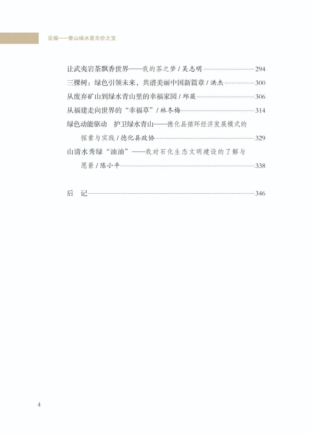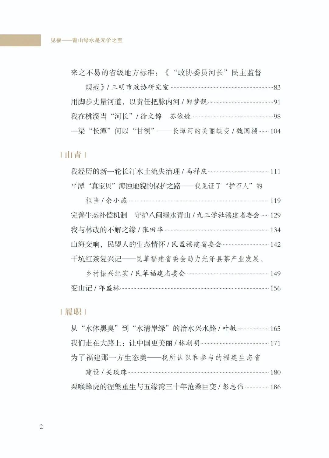 十三屆福建省政協(xié)提出“為閩協(xié)商 為民服務(wù)”品牌建設(shè)的要求,積極探索文史工作的新方法,努力推進(jìn)文史資料專(zhuān)題化、系列化。這些文史資料具有“存史、資政、團(tuán)結(jié)、育人”的社會(huì)功能,是打造具有鮮明時(shí)代特征、福建特色、政協(xié)特點(diǎn)的文史圖書(shū)品牌的寶貴素材。《青山綠水是無(wú)價(jià)之寶》是“見(jiàn)福”系列圖書(shū)之開(kāi)篇,我們從福建各級(jí)政協(xié)和各民主黨派、工商聯(lián)踐行習(xí)近平生態(tài)文明思想破題,采摭諸多“三親”,雖管中窺豹,知秋一葉;但綠水鑒影,青山作證,20多年來(lái),福建牢記囑托,堅(jiān)持一張藍(lán)圖繪到底。我們共同參與,一路前行,與有榮焉。