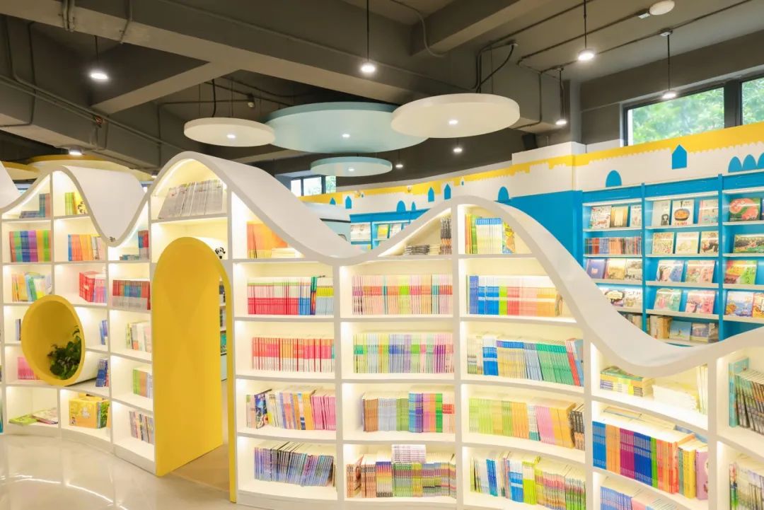 書城三樓為少兒讀物區(qū),該區(qū)書架和展臺以藍(lán)、黃、綠、白等色調(diào)進(jìn)行碰撞,將土樓、海浪與卡通動物造型進(jìn)行抽象化展現(xiàn),突顯活潑、歡快的童趣主基調(diào)。同時(shí)劃分出手工區(qū)、活動區(qū)、繪本借閱區(qū)等功能區(qū)域,充分滿足不同年齡段小朋友們的個(gè)性化需求。