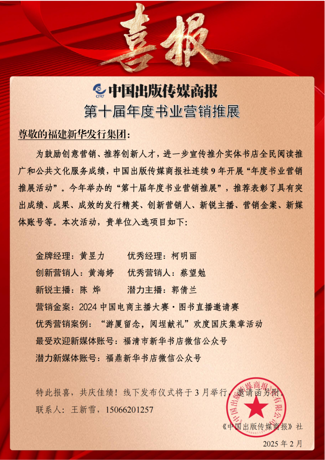 近日,由中國出版?zhèn)髅缴虉蟀l(fā)起的“第十屆年度書業(yè)營銷推展”活動結(jié)果揭曉,福建新華發(fā)行集團(tuán)攬獲10個獎項(xiàng)。
