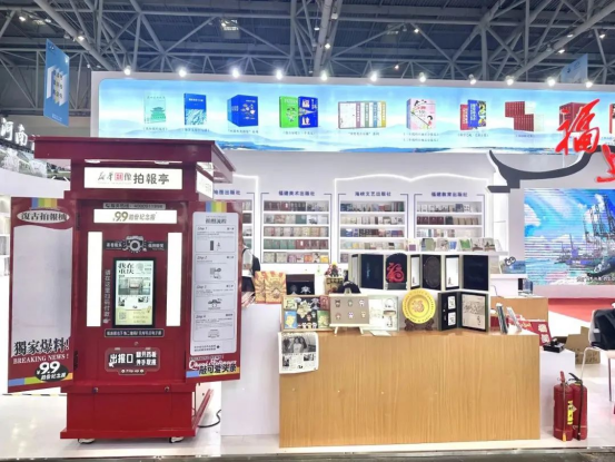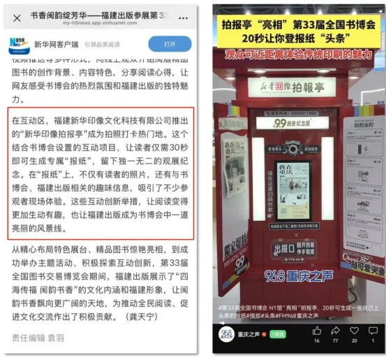 創新互動裝置的亮點,當屬“新華印像拍報亭”。其紅色復古報亭造型與即時生成個性化紀念報紙的體驗,完美契合懷舊情懷與個性化表達潮流,成為全場焦點。拍報亭前人流如織,觀眾紛紛分享至社交平臺,使其迅速躥升為熱門“文化打卡點”,其新穎形式與文化價值更受到媒體廣泛關注,新華網客戶端、重慶之聲視頻號等平臺均對此進行了報道。展會期間拍報亭還吸引了甘肅新華書店、新疆大學出版社、江蘇鳳凰新華書店等十余家省市級單位及文旅企業前來商洽合作意向。這一創新互動形式,不僅聚攏超高人氣,更在傳播中有效助力“閩派”出版物及文化的推廣。