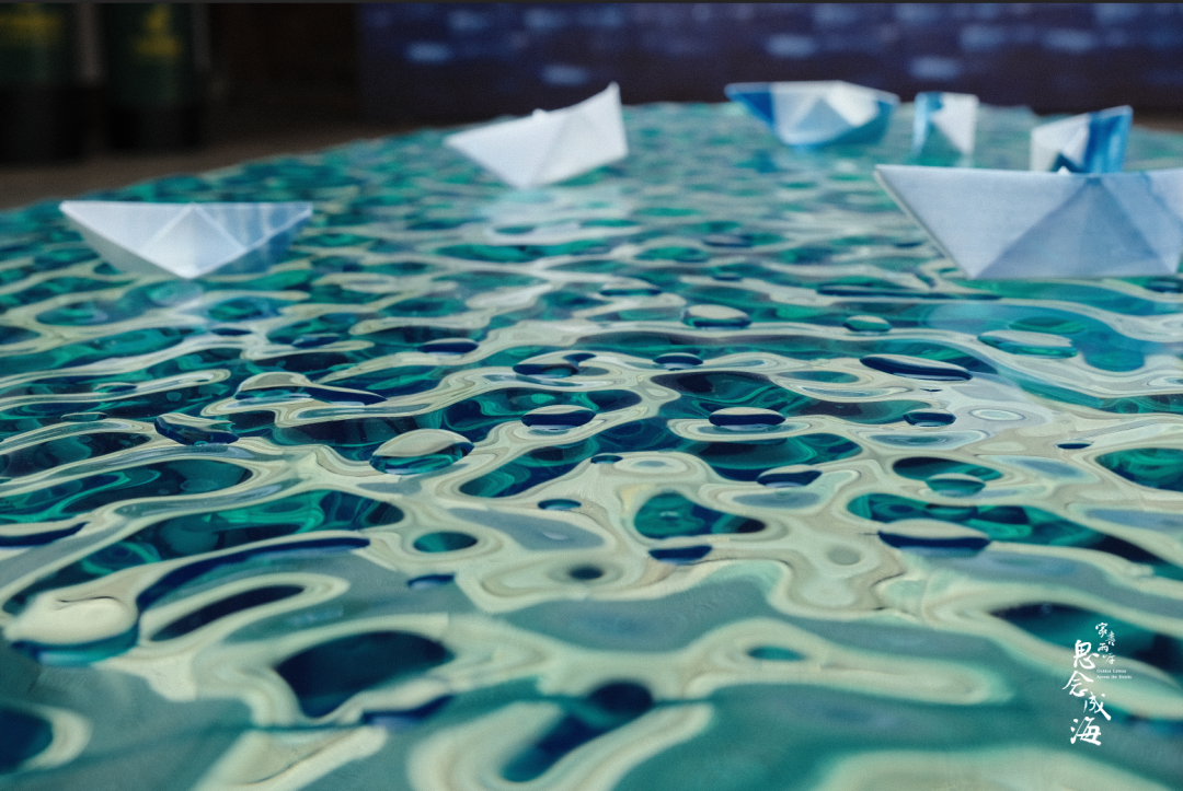 福建,山海相連,自古便與海洋結下不解之緣,福建的海洋故事跨越千年,從未間斷。福建海洋文化外向、開拓、包容、和平、進取,扎根中華文明的沃土,不斷吸收外來文明精華,從而形成海陸互動的大格局。本次展覽整體設計圍繞“思念成海”的概念,突出福建“海洋文化”元素。場館中,家書信紙飄落匯成海洋,一滴眼淚凝成海峽對岸的臺灣島,以“海平面”為時間軸串聯起兩岸歷史等設計,既突出了兩岸同根同源、血脈相親,又通過海的深邃感、包容感充分展現福建海洋文化的悠久歷史和豐富內涵,以及閩人與海洋相融共生的智慧和勇氣。
