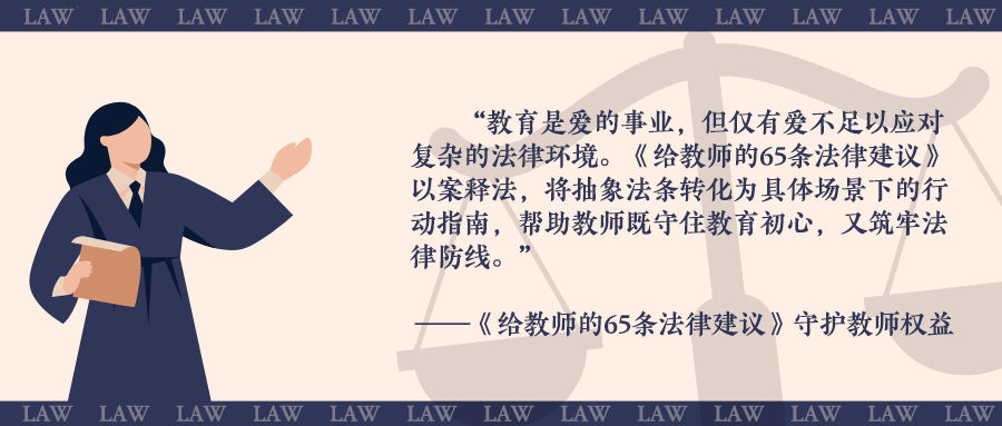 從日常教育管理到學(xué)生權(quán)利維護(hù),從校園安全管理到教師職業(yè)保護(hù), 65條建議涵蓋4大核心板塊,聚焦體罰邊界、懲戒尺度、隱私保護(hù)、手機(jī)管理、校園欺凌、安全事故應(yīng)對(duì)、職稱糾紛、工資維權(quán)等教師關(guān)心的熱點(diǎn)問題。