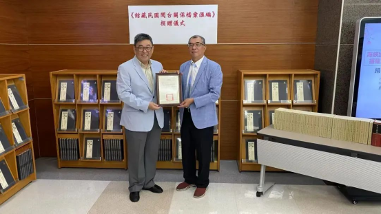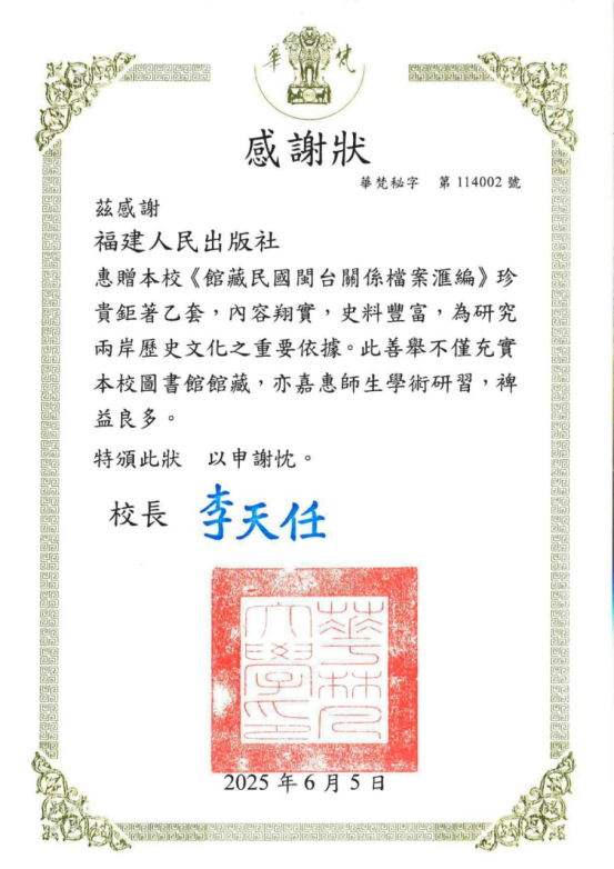 今年6月,在第二屆海峽閱讀大會開幕式上舉辦了《館藏民國閩臺關系檔案匯編》(100冊)新書發布會,海峽出版發行集團黨委副書記、總經理嚴桂忠向臺灣華梵大學代表贈送圖書。華梵大學對此高度重視,于8月7日在該校圖書館舉行了隆重的受贈儀式。參加儀式的有華梵大學校長李天任、臺灣出版協會理事長楊蓮福、臺灣出版協會秘書長李錫敏、臺灣萬卷樓圖書股份有限公司總編輯張晏瑞等人。