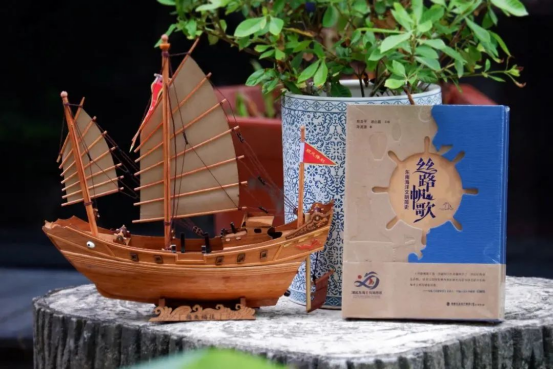 該書裝幀設計新穎,匠心獨運,封面的鏤刻線條恰似福建曲折漫長的海岸線,藍黃兩色勾勒出“陸地”和“海洋”相接的輪廓,瓷器、福船、媽祖石雕像、羅星塔等具有福建海洋特色的元素以壓凹的形式點綴其上,書名“絲路帆歌”則集中在一個“船舵”形狀的圖形中,與書相配套的還有一艘由非遺技藝傳承人打造的福船,可以說整本書都充滿了福建獨特的海洋氣息。