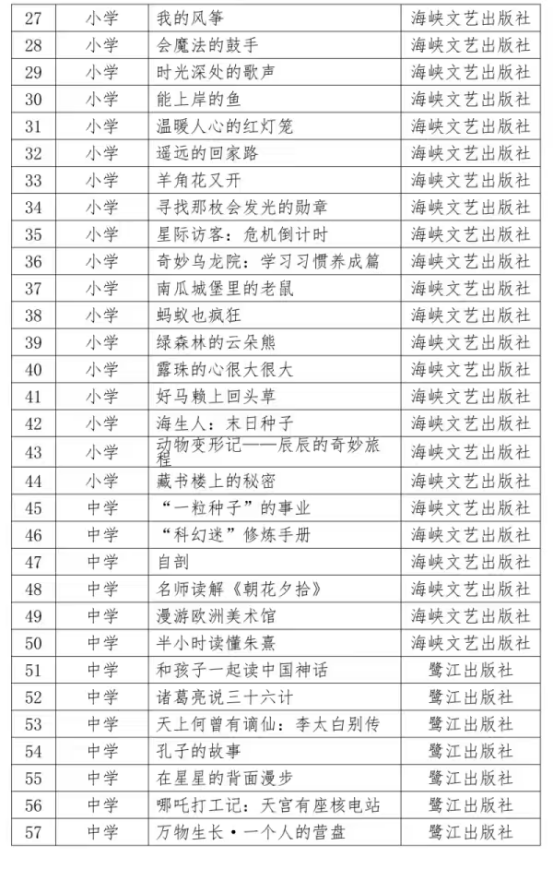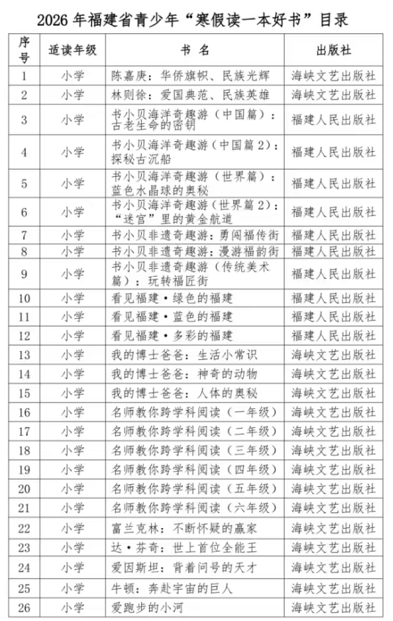 近日,福建省全民閱讀促進會組織專家編制并發布了《2026年福建省青少年“寒假讀一本好書”目錄》,共選定優秀圖書57種,其中包括小學階段推薦圖書44種,中學階段13種。